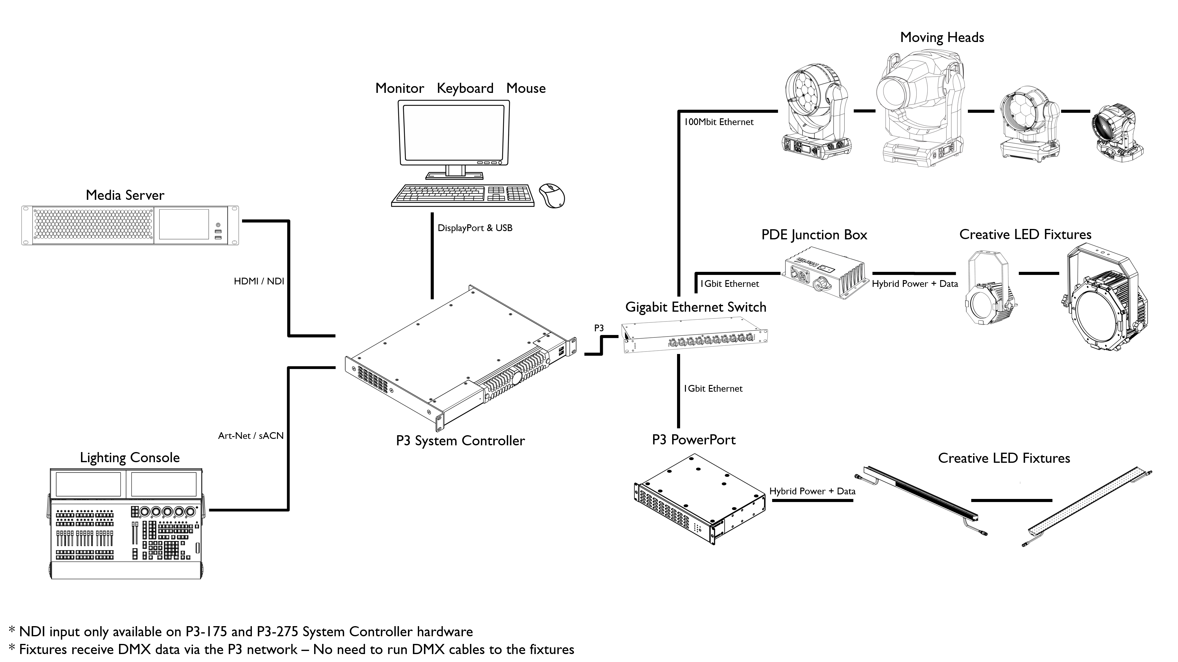 | P3 Output | 1 network with up to 100.000 pixels worth of fixtures Maximum 2.000 fixtures |